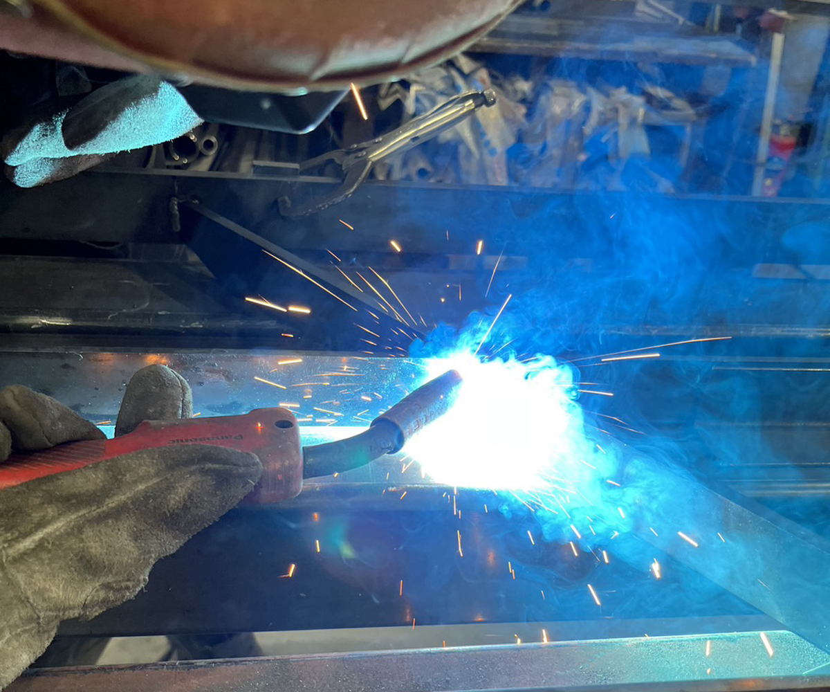 照明ボックスに使用する建築金物の溶接作業中の様子です。日々技術の向上のため職人たちが汗を流しています。